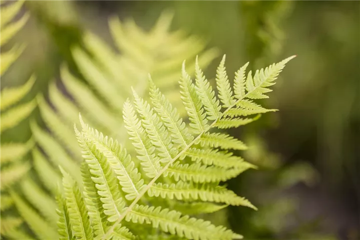 Hoher Blattschmuckwert. Die wintergrünen Blätter des Goldschuppenfarns sind dunkelgrün, gefiedert. Bernsteingelber Austrieb.