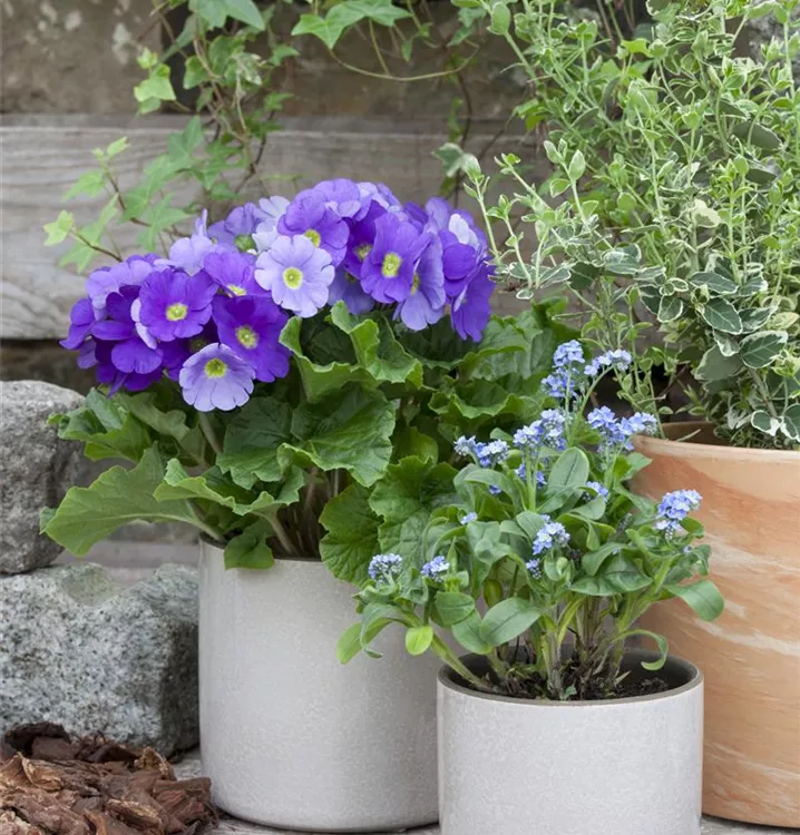 Primula obconica bildet schalenförmige, rote, violette, weiße Blüten ab März.