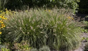 Das Garten-Federborstengras 'Hameln' (Pennisetum alopecuroides) ist mit seiner dunkelgrünen Blattfärbung ein dekoratives Gestaltungselement im Garten, welches sich an einem sonnigen Standort mit einem möglichst durchlässigen, nährstoffreichen Boden am wohlsten fühlt. Die goldgelben Blütenwedel schmücken die buschig, aufrecht und horstbildend wachsende Pflanze ab Sommer. Bei günstigen Bedingungen erreicht dieses winterharte Gras eine Höhe von ca. 35 cm und wird bis zu 30 cm breit.