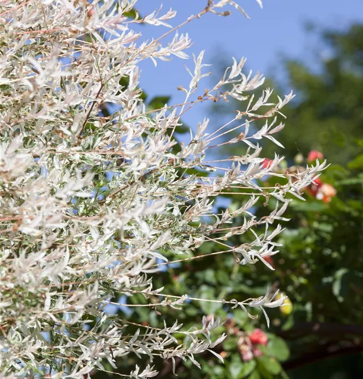 Die Harlekin-Weide 'Hakuro Nishiki' (Salix integra) ist ein buschiger, dichter, Strauch mit dekorativen sommergrünen, lanzettlichen, grün-weißen Blättern. Auch der weiß-rosafarbene Austrieb ist sehr schön.