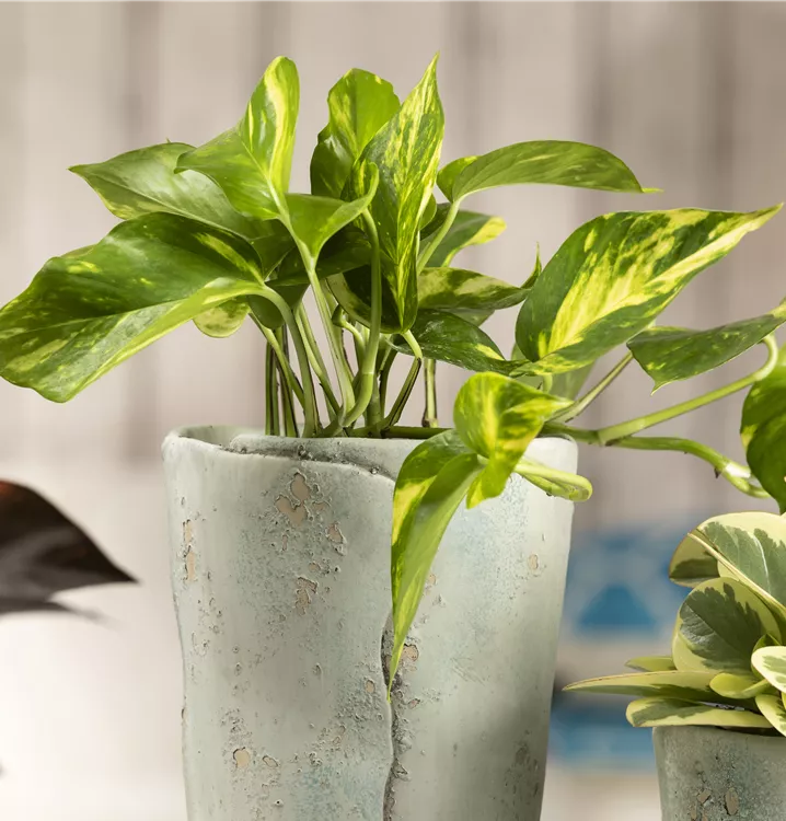 Die Goldene Efeutute (Epipremnum aureum) trägt mehrfarbige, herzförmige Blätter. Diese kriechende bzw. kletternde Pflanze gedeiht am besten an einem sonnigen bis halbschattigen Standort.