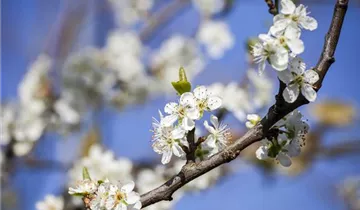 Prunus domestica subsp. syriaca bildet weiße Blüten ab März.