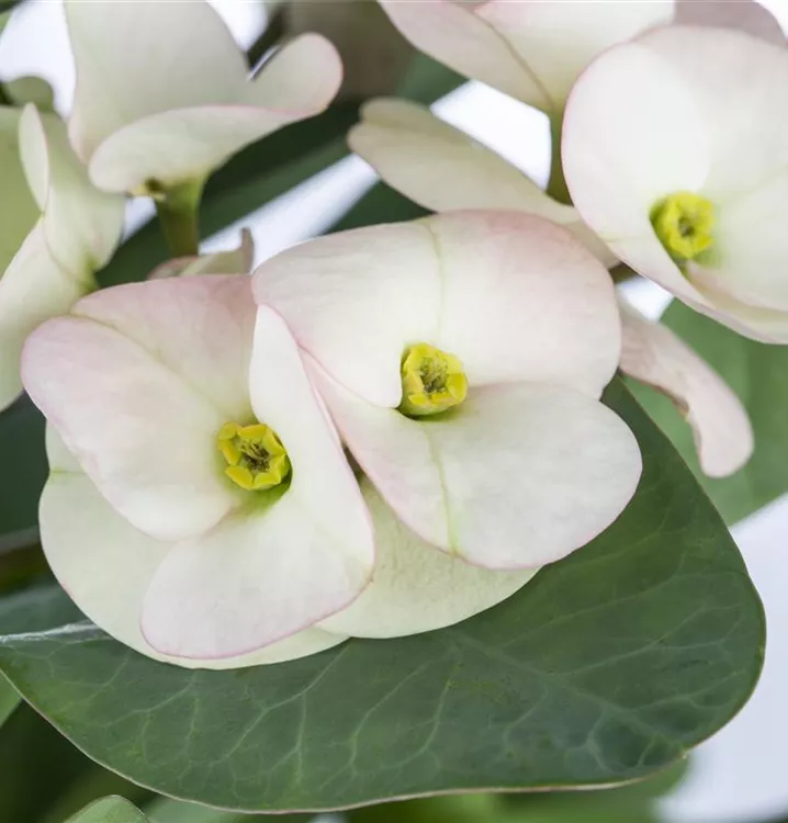Der Christusdorn (Euphorbia milii) ist eine rot blühende Pflanze, die lanzettliche, mittelgrüne Blätter trägt. Seine tellerförmigen Blüten erscheinen in Trugdolden von November bis April. Diese kompakte und strauchartige Pflanze gedeiht am besten an einem sonnigen Standort.
