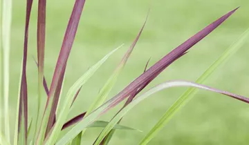 Die sommergrünen Blätter des Garten-Blutgrases 'Red Baron' sind grün-rot, lineal. Garten-Blutgras 'Red Baron' zeigt sich leuchtend rot im Herbst.