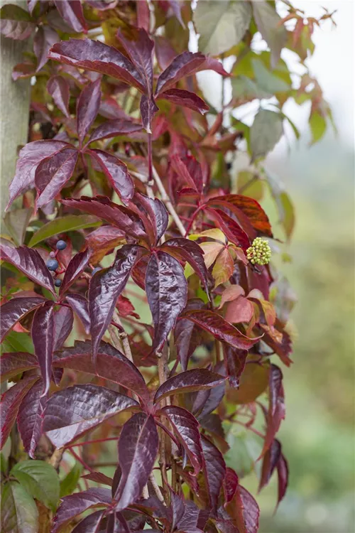 Besonders dekorativ sind die blauen, runden Früchte von Parthenocissus quinquefolia. Diese erscheinen ab September.