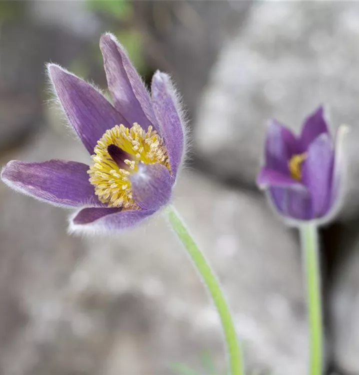 Pulsatilla vulgaris bildet glockenförmige, blauviolette Blüten ab März.