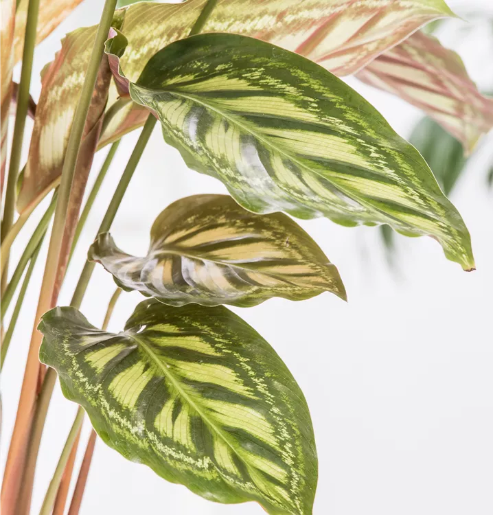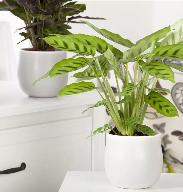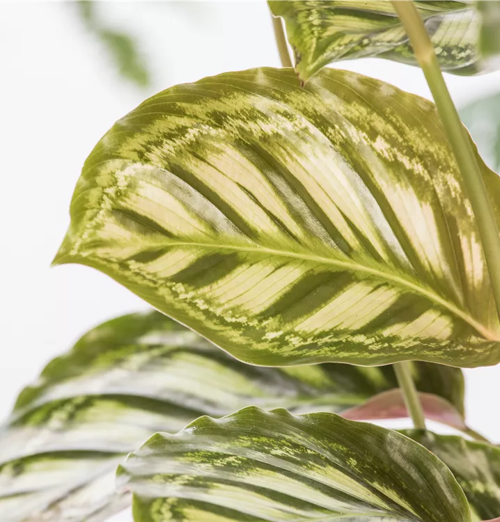 Die Korbmarante (Calathea) ist eine Pflanze mit dekorativen, mehrfarbigen Blättern. Sie sind eiförmig und gewellt. Bevorzugt wird ein halbschattiger Standort.