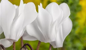 Das Alpenveilchen (Cyclamen persicum) ist eine weiß blühende Pflanze, die herzförmige, gezähnte Blätter trägt. Seine Blüten verströmen einen angenehmen Duft und erscheinen von September bis April. Diese aufrechte und dichte Pflanze gedeiht am besten an einem sonnigen bis halbschattigen Standort.