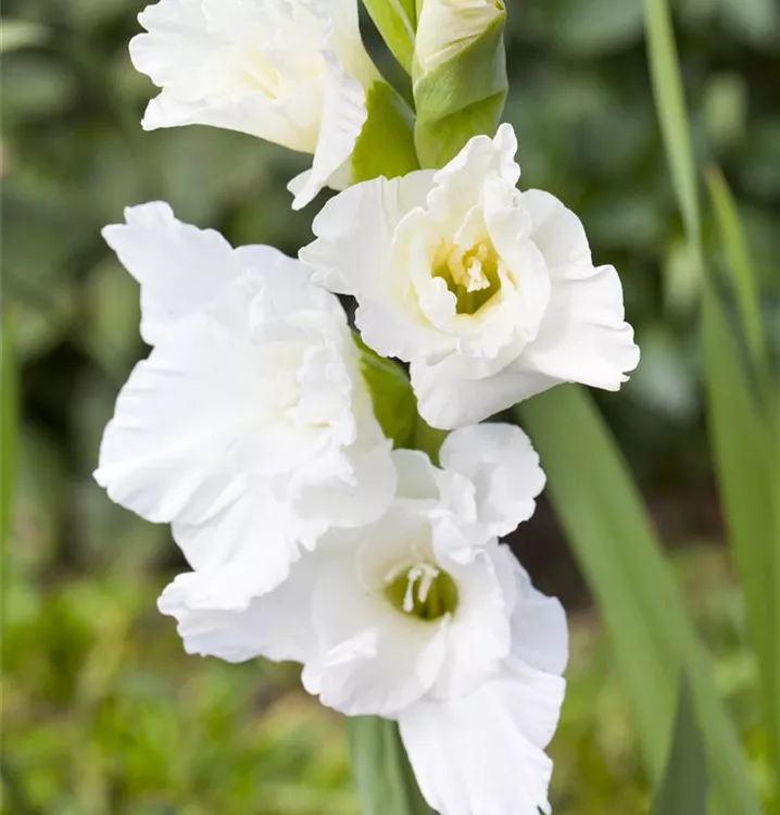 Die Gladiole (Gladiolus) blüht über Monate hinweg. Je nach Sorte, erscheinen die dekorativen Blüten in den Farben Weiß, Rosa und Gelb. Bevorzugt wird ein sonniger bis halbschattiger Standort und eine durchlässige Erde.