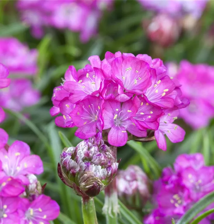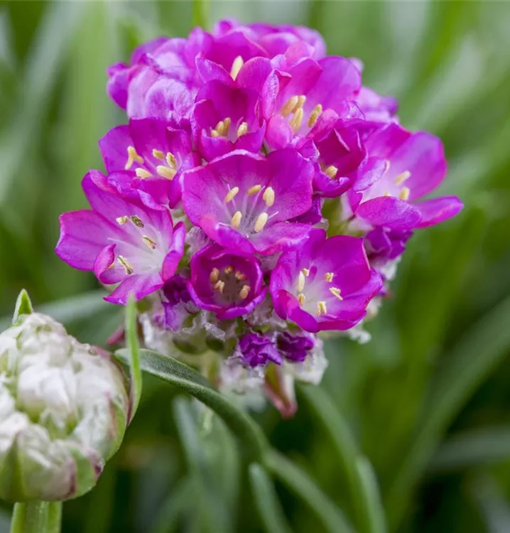 Die Strand-Grasnelke (Armeria maritima) ist eine aufrechte, horstbildende wintergrüne Staude, die, je nach Sorte, ballförmige Blüten in verschiedenen Farben bildet. An einem sonnigen Standort mit durchlässigem, nährstoffreichem, sandigem Boden erreicht sie gewöhnlich eine Höhe von ca. 20 cm und wird ca. 20 cm breit. Die Strand-Grasnelke ist gut frostverträglich.