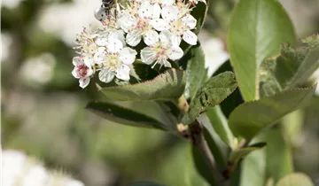 Aronia x prunifolia 'Nero' bildet weiße Blüten ab Mai.