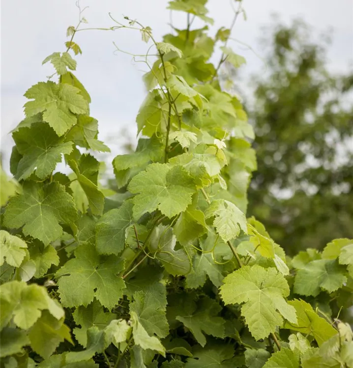 Die sommergrünen Blätter der Weintraube sind dunkelgrün, herzförmig, gezähnt. Weintraube zeigt sich leuchtend kupfergelb bis rot im Herbst.