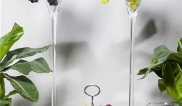 Die Weintraube (Vitis vinifera) bildet blauviolette, grüngelbe Früchte. Sie sind oval und haben einen süß-säuerlichen Geschmack. Für eine ertragreiche Ernte ab August schaffen durchlässiger, nährstoffreicher, sandiger Boden und ein sonniger bis halbschattiger Standort optimale Bedingungen. Auch ihre gelb-grünen, leicht duftenden Blüten sind eine schöne Erscheinung.