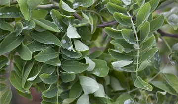Die sommergrünen Blätter der Scheinakazie sind dunkelgrün, gefiedert, wechselständig. Scheinakazie zeigt sich leuchtend gelb im Herbst.