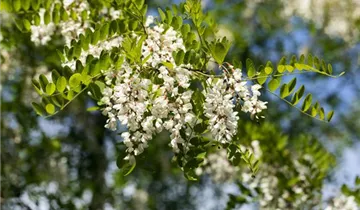 Die weißen Blüten der Scheinakazie erscheinen in Trauben von Ende Mai bis Anfang Juni. Diese sind stark duftend.