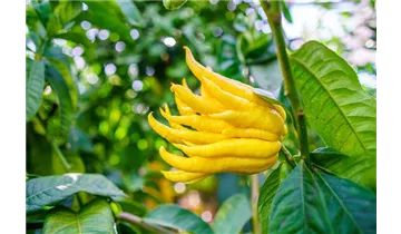 Die Buddha's Hand (Citrus medica) ist eine sehr beliebte Kübelpflanze, deren gelben Früchte bei guter Pflege möglich sind. Ihre weißen Blüten sind radförmig und erscheinen von April bis September. Sie verströmen einen starken Duft. Verwenden Sie bevorzugt die spezielle Kübelpflanzenerde, denn sie verdichtet sich über längere Zeit nicht.