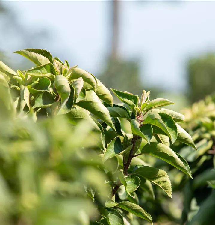 Die sommergrünen Blätter des Zierapfels 'Pom Zai'® sind dunkelgrün, lanzettlich. Zierapfel 'Pom Zai'® zeigt sich leuchtend gelbbunt im Herbst.