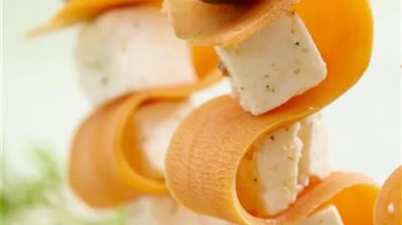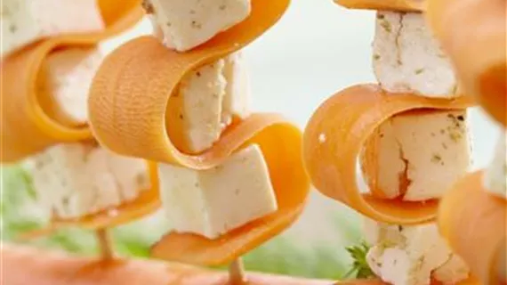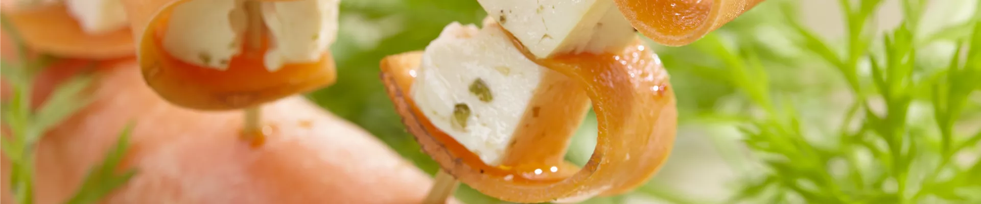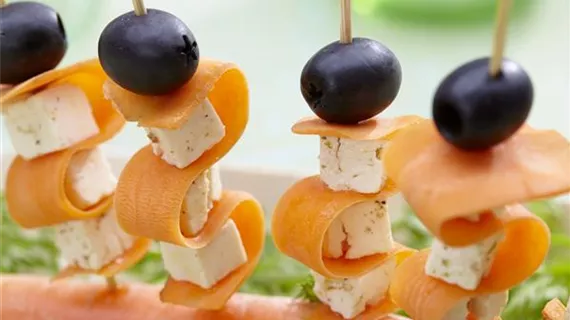 Fetakäse in kleine Würfel schneiden und die Oliven abwaschen. Dann wird alles auf die Spieße verteilt, auf jeden Spieß steckt man einen Karottenstreifen, drei Fetawürfel und eine Olive.